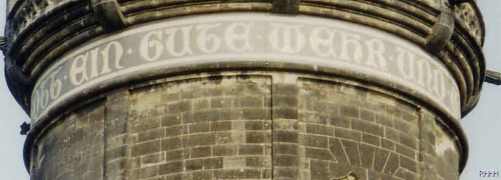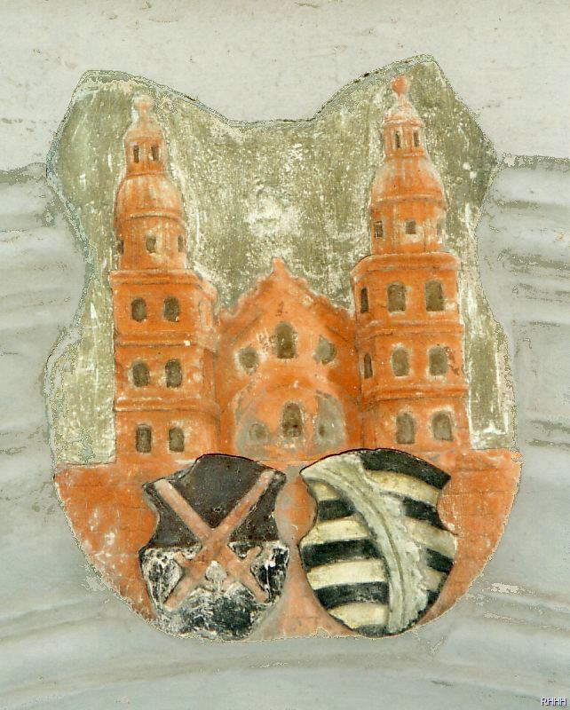 Betrachten wir zunächst einmal eine alte Version des Stadtwappens der Lutherstadt Wittenberg. (Die neue findet man auf der Website der Stadt und natürlich in der Stadt selbst, es lohnt sich also hinzufahren!) Dieses Wappen befindet sich an einer der ältesten Schulen der Stadt, dem „Gymnasium Wittenbergense“ am Kirchhof der Stadtkirche, 1564 gebaut. |